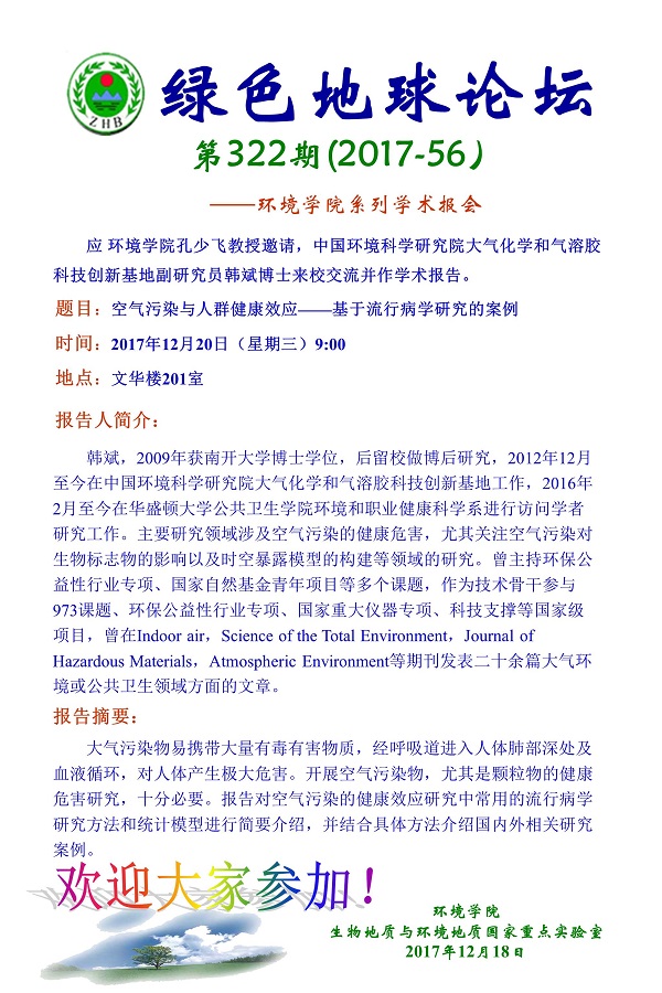 绿色地球论坛第322期(2017-56)——吃瓜网 系列学术报告会 题目:空气污染与人群健康效应——基于流行病学研究的案例 时间:2017年12月20日(星期三) 上午9:00 地点:文华楼201室