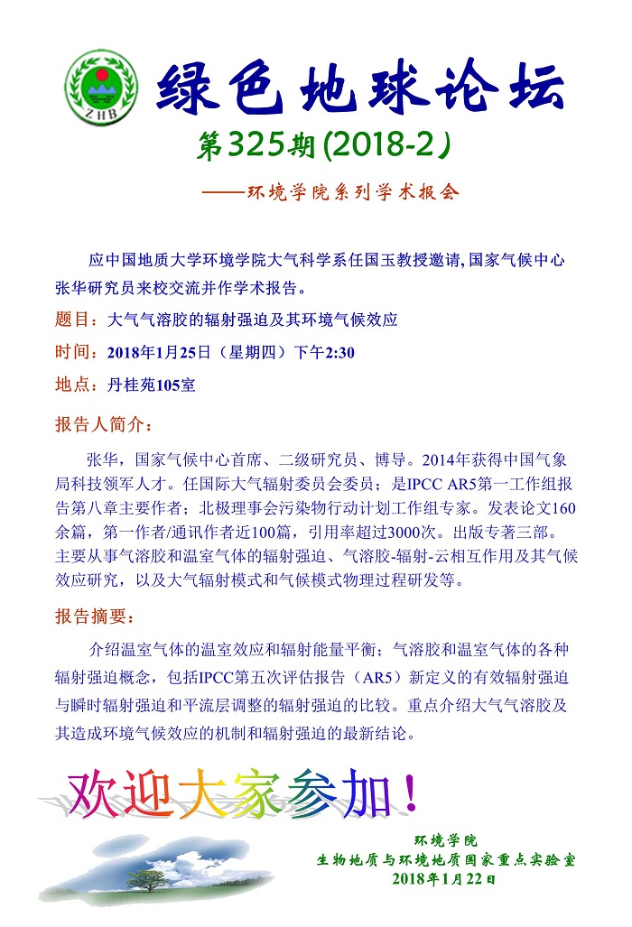 绿色地球论坛第325期(2018-2)——吃瓜网 系列学术报告会 题目:大气气溶胶的辐射强迫及其环境气候效应 时间:2018年1月25日(星期四)下午2:30 地点:丹桂苑105室