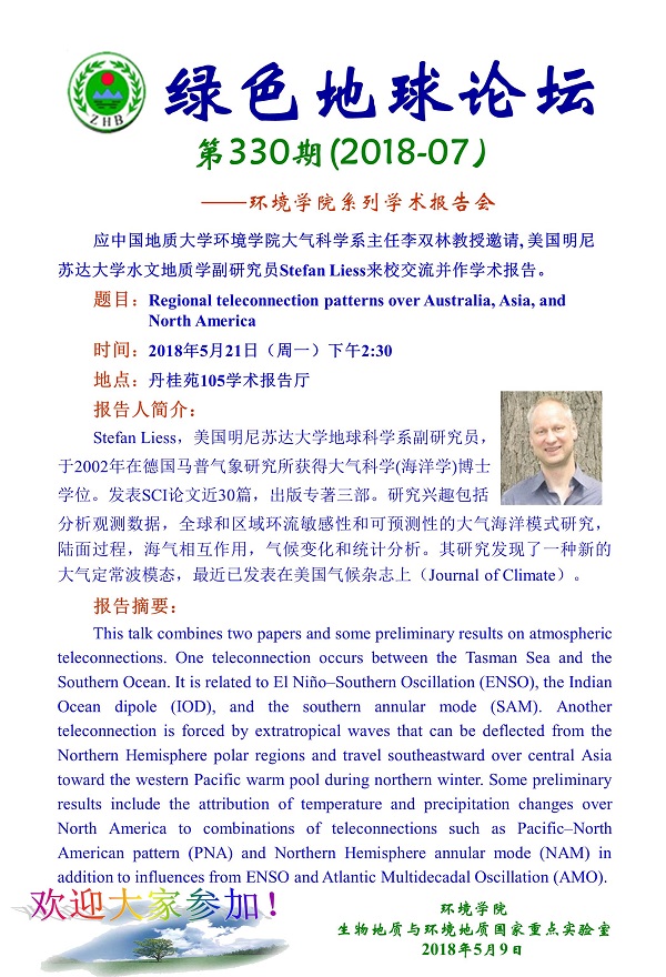 绿色地球论坛第330期(2018-7) ——吃瓜网 系列学术报告会 题目:Regional teleconnection patterns over Australia,Asia, and North America 时间:2018年5月21日(周一)下午14:30 地点:丹桂苑105学术报告厅