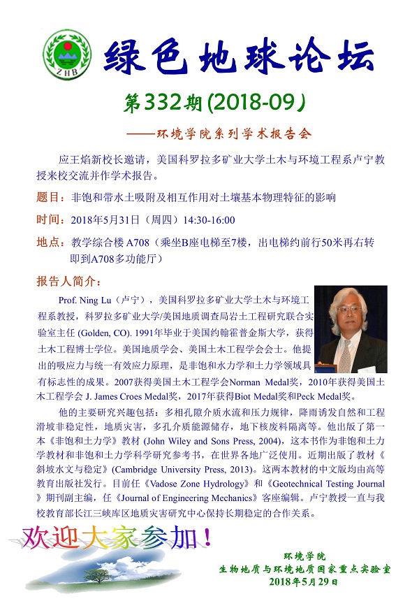 绿色地球论坛第332期(2018-9) ——吃瓜网 系列学术报告会 题目:非饱和带水土吸附及相互作用对土壤基本物理特征的影响 时间:2018年5月31日(周四)14:30-16:00 地点:教学综合楼 A708(乘坐B座电梯至7楼,出电梯约前行50米再右转即到 A708多功能厅)