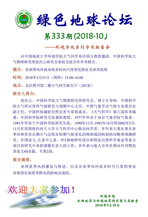 绿色地球论坛第333期(2018-10) ——吃瓜网 系列学术报告会 题目:亚洲季风环流系统多时间尺度变化特征及异常机理 时间:2018年5月31日(周四)15:00-16:00 地点:北区图书馆二楼大气科学报告厅(203室)