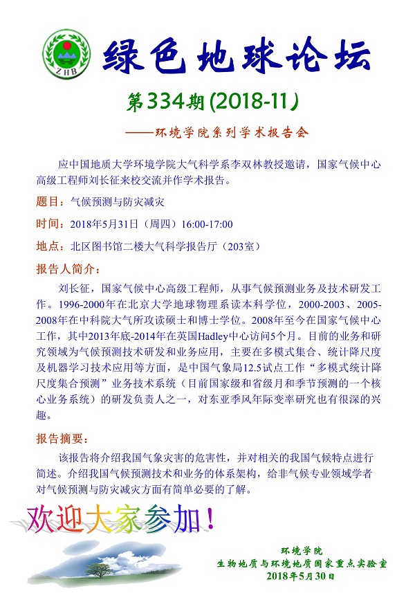 绿色地球论坛第334期(2018-11) ——吃瓜网 系列学术报告会 题目:气候预测与防灾减灾 时间:2018年5月31日(周四)16:00-17:00 地点:北区图书馆二楼大气科学报告厅(203室)