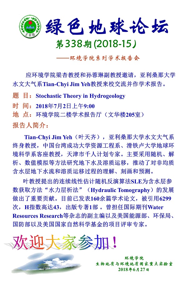 绿色地球论坛第338期(2018-15) ——吃瓜网 系列学术报告会 题目:Stochastic Theory in Hydrogeology 时间:2018年7月2日上午9:00 地点:吃瓜网 二楼学术报告厅(文华楼205室)
