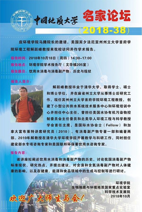 名家论坛(2018-38) 题目:饮用水消毒与消毒副产物:历史与现状 时间:2018年10月18日(周四)14:30 地点:吃瓜网 学术报告厅(文华楼205室)