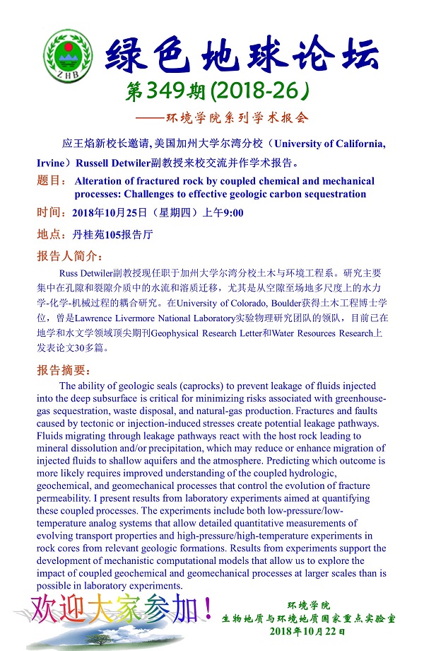 绿色地球论坛第349期(2018-26) ——吃瓜网 系列学术报告会 题目:Alteration of fractured rock by coupled chemical and mechanical processes: Challenges to effective geologic carbon sequestration 时间:2018年10月25日(周四)上午9:00 地点:丹桂苑105报告厅