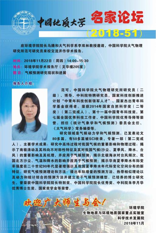 名家论坛(2018-51) 题目:气候预测研究现状和进展 时间:2018年11月22日(周四)14:00 地点:吃瓜网 学术报告厅(文华楼205室)