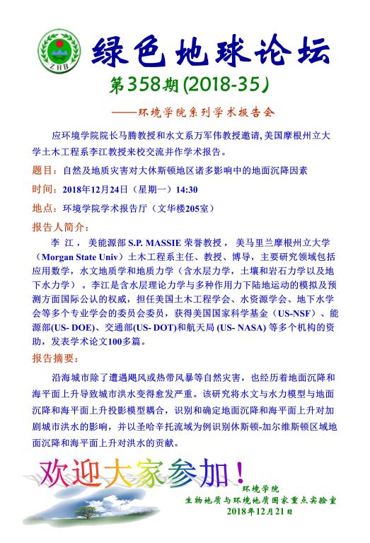 绿色地球论坛第358期(2018-35) ——吃瓜网 系列学术报告会 题目:自然及地质灾害对大休斯顿地区诸多影响中的地面沉降因素 时间:2018年12月24日(周一)14:30 地点:吃瓜网 学术报告厅(文华楼205室)