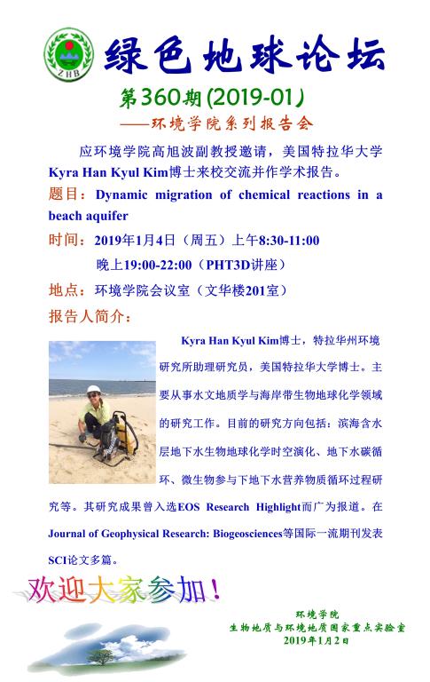 绿色地球论坛第360期(2019-01) ——吃瓜网 系列学术报告会 题目:Dynamic migration of chemical reactions in a beach aquifer 时间:2019年1月4日(周五)8:30—11:00 19:00-22:00(PHT3D讲座) 地点:环境吃瓜网 会议室(文华楼201室)