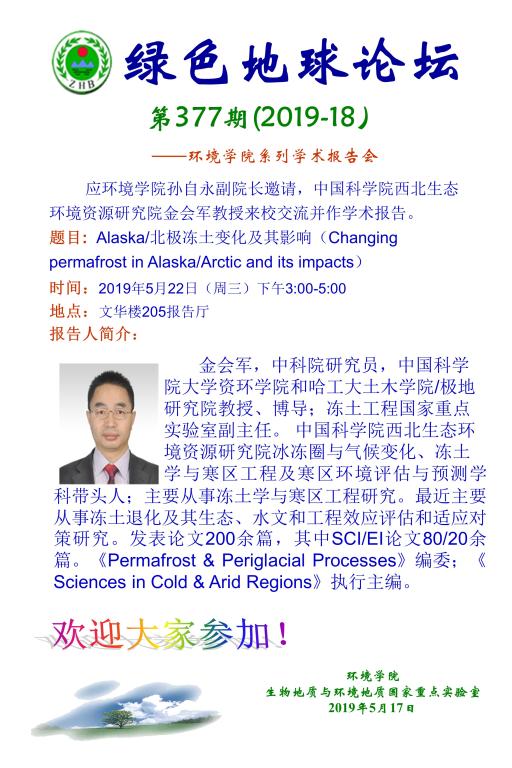 题目: Alaska/北极冻土变化及其影响(Changing permafrost in Alaska/Arctic and its impacts) 时间:2019年5月22日(星期三)下午3:00—5:00 地点:文华楼205报告厅