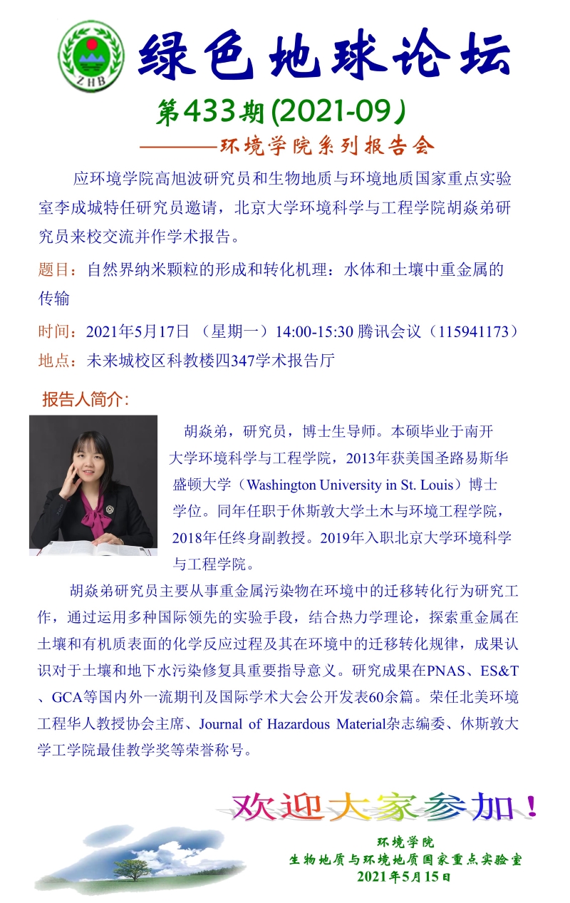 北京大学环境科学与工程吃瓜网 胡焱弟研究员学术报告