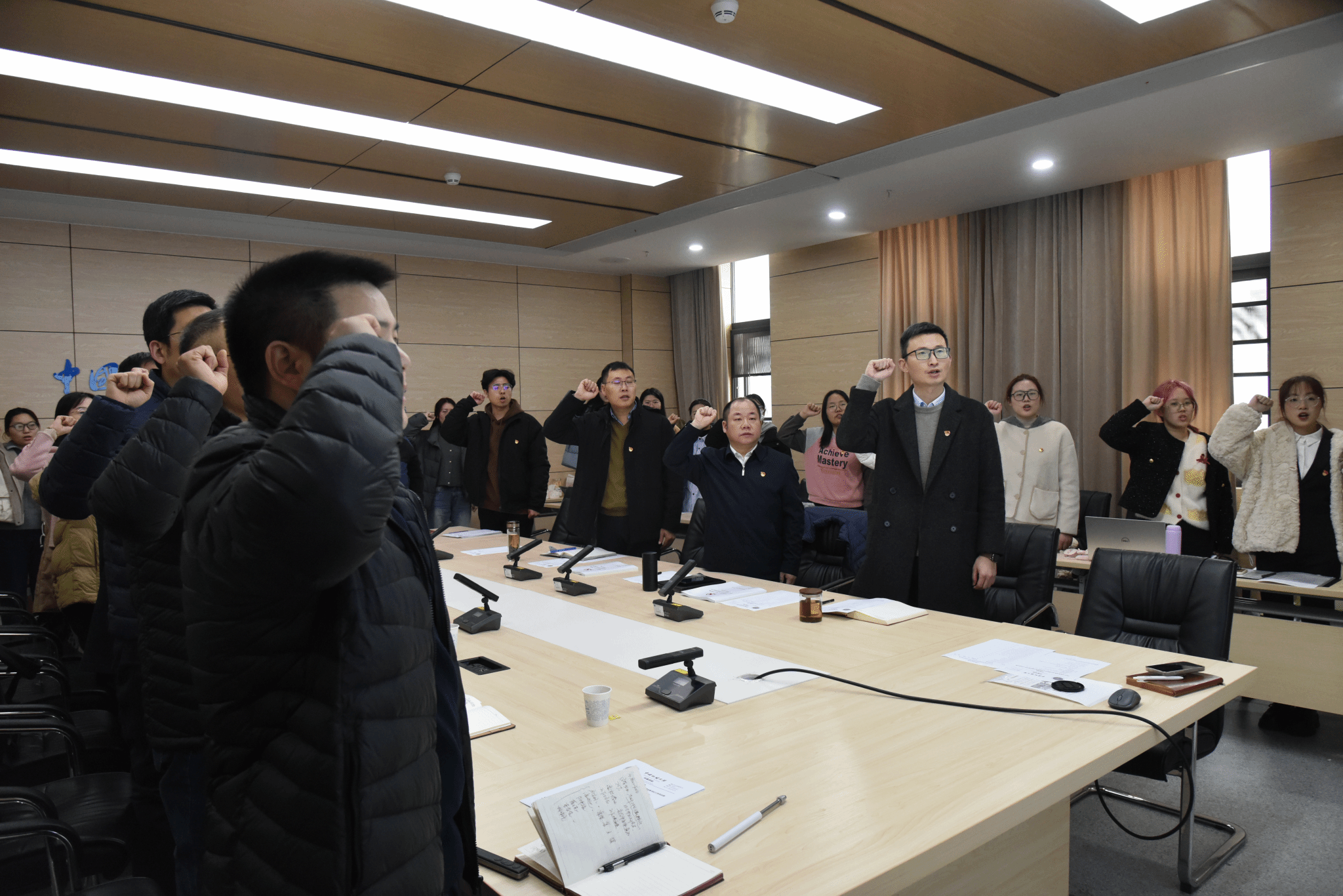 参会人员齐唱国歌,全体党员重温入党誓词,吃瓜网 党委书记姜明敏领誓。