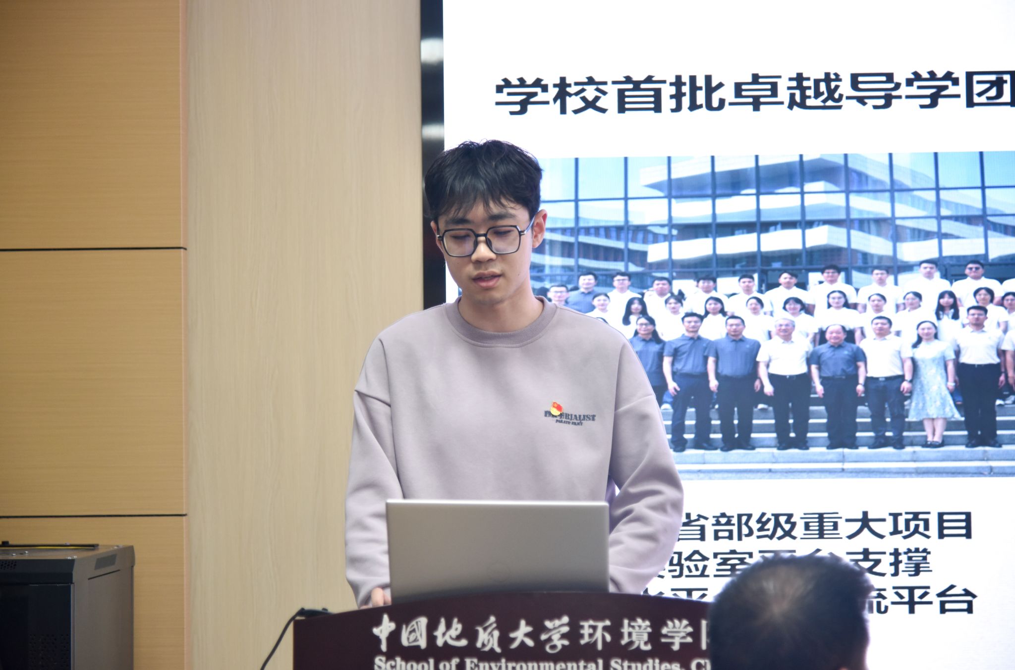 全体党员唱国歌、重温入党誓词。环境水文地质研究生第一党支部党员马晨晰领誓。