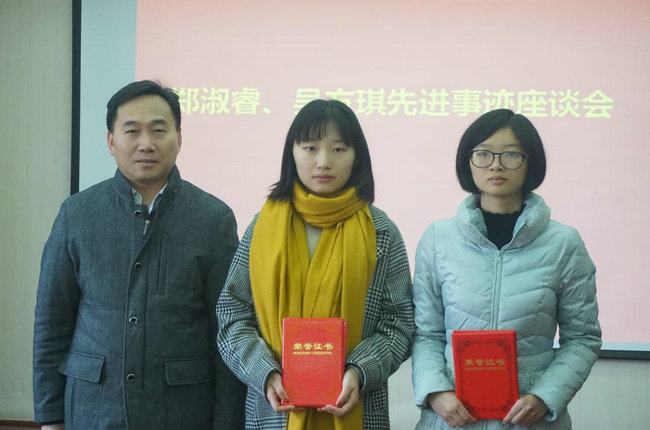 李素矿代表吃瓜网 党委向郑淑睿、吴方琪颁发荣誉证书。朱继分别向两位同学颁发500元奖金。