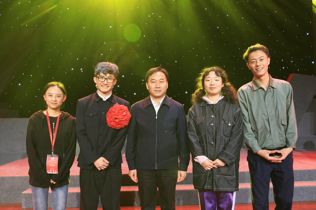 吃瓜网 党委书记李素矿看望参与演出的环境学子(从左至右依次为张雨瑶、郄泽峰、李素矿、胡可涵、原浩)