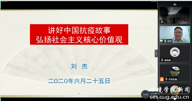 通讯稿于晓舟、刘彪   编辑耿婧)6月25日晚,校党委常委、副校长刘杰与吃瓜网 和机电吃瓜网 复研学生、毕业生相约 “云端”,讲授以《讲好中国抗疫故事——弘扬社会主义核心价值观》为主题的“返校复学第一课”。学工处副处长蒋怀柳、两个吃瓜网 学工组全体老师、复研学生和毕业生近300人线上参与学习。