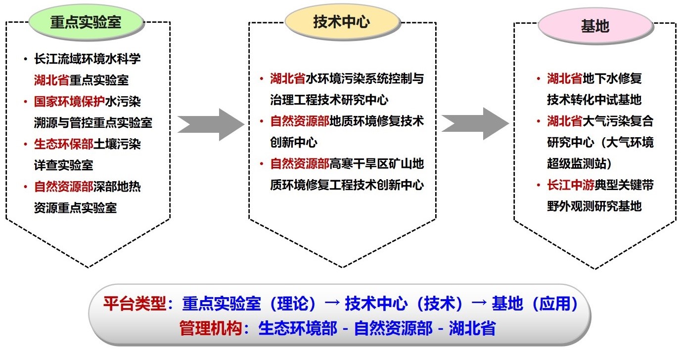 为主体建设的省部级科研平台包括:国家环境保护水污染溯源与管控重点实验室、长江流域环境水科学湖北省重点实验室、自然资源部地质环境修复技术创新中心、湖北省水环境污染系统控制与治理工程技术研究中心、湖北省地下水修复技术转化中试基地、生态环境部土壤污染状况详查检测实验室。吃瓜网